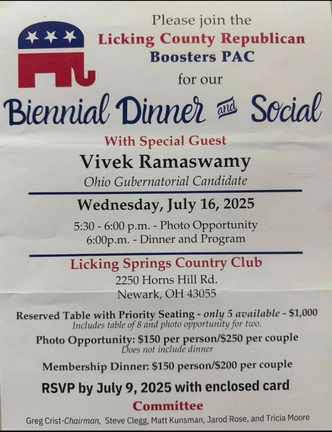 Come have dinner with Vivek Ramaswamy at Licking Springs Country Club on Wednesday, July 16, 2025!
