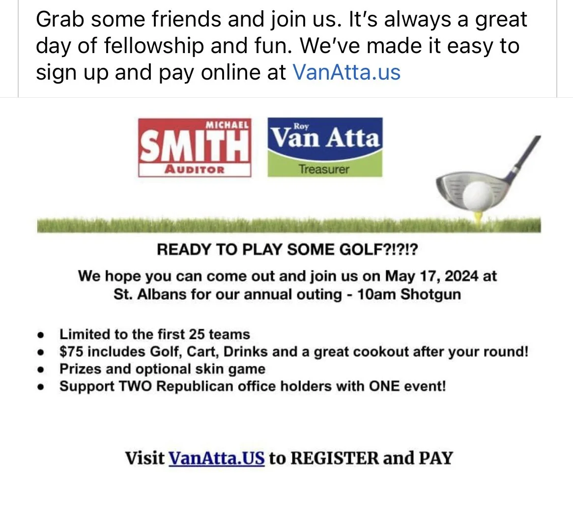 Don’t miss this annual Republican golf outing! May 15 Written By Bambi Wright Click here to register Bambi Wright