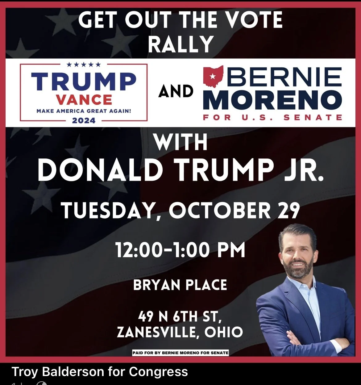 Join Donald Trump Jr. in Zanesville on Tuesday as we get out the vote for Ohio ‘s next Senator, Bernie Moreno Oct 28 Written By Bambi Wright Message from Troy Balderson for Congress Bambi Wright