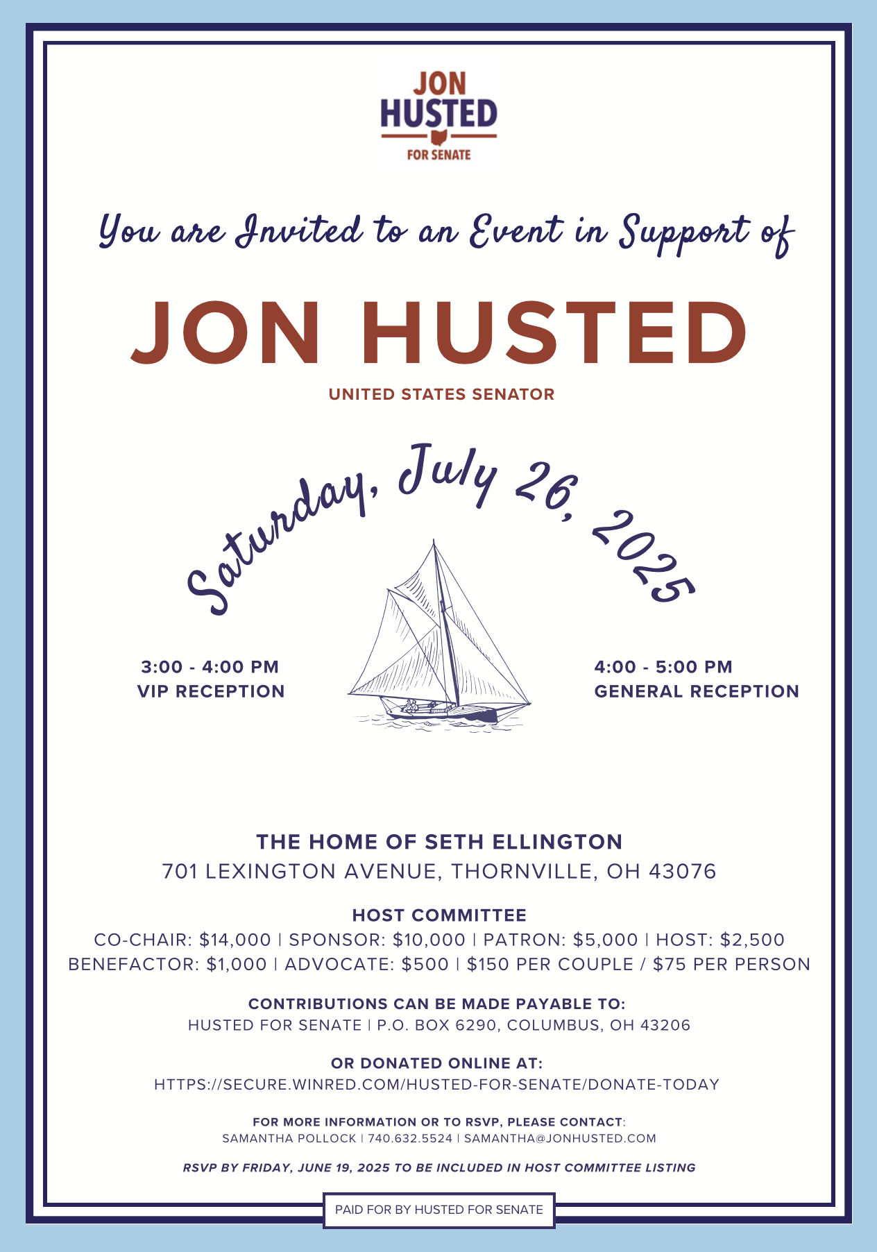 Plan to attend an important fundraiser for our newest Senator, Jon Husted on July 26, 2025 Jun 30 Written By Bambi Wright Don’t miss this great opportunity at a beautiful location! Bambi Wright