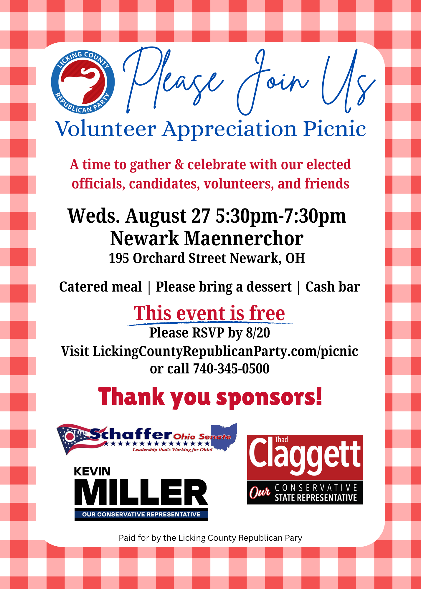 Join us for a free picnic to celebrate Licking County Republican volunteers. Please consider bringing a dessert!